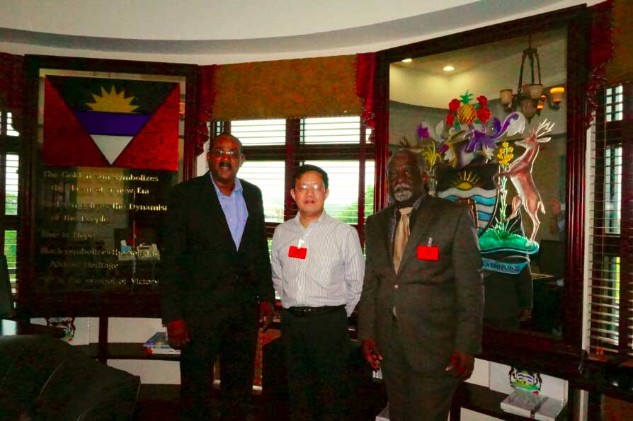 图为安提瓜投资服务中心主任Frank(中间)与安提瓜总理贾斯顿·布朗(左一)、安提瓜著名大律师、安提瓜前总检察长希尔先生合影
